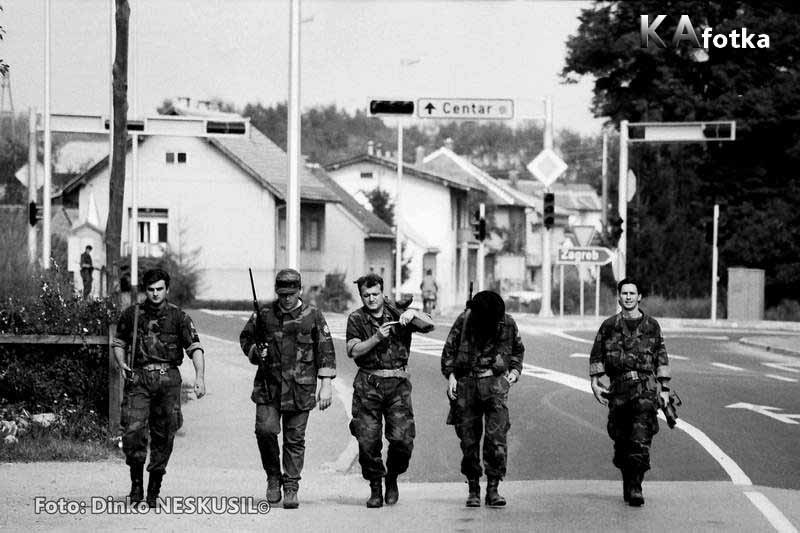 22. rujna 1991. godine. Dan nakon izlaska tenkova iz Logorišta povratak iz Mostanja na Turanj i na položaje na Škrtić brdu. Na slici s lijeva Car, Lipak, Deda, Paganini, Cela