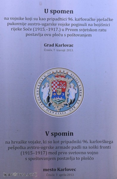Na protijek sto godina od Prvog svjetskog rata i njegove žrtve, pogotovo one karlovačkog kraja, podsjetila je delegacija Grada Karlovac predvođena gradonačelnikom Damirom Jelićem i njegovim zamjenikom Dubravkom Delićem u kojoj su bile i karlovačke udruge, ustanove i škole. Tako su položeni vijenci i zapaljene svijeće na vojnom groblju u Črniču, te zasađena spomen lipa na spomeniku Prvom svjetskom ratu u Lokvici. Posjet Črniču i Lokvici nije slučajan jer je tamo živote položilo na stotine Karlovčana koji su na Soškom frontu ratovali kao dio 96. karlovačke pješadijske pukovnije. Ovu uspomenu na poginule vojnike Grad Karlovac obilježava već treću godinu za redom, a ovog puta odana je počast i u talijanskoj Redipugliji gdje je pokopano 80 tisuća znanih i neznanih poginulih vojnika iz Prvog svjetskog rata. Karlovačka delegacija prisustvovala je i otvorenju izložbe u muzeju Nove Gorice posvećenu upravo 96. karlovačkoj pješadijskoj pukovniji koja je ratovala na tom području. Nije izostala niti dobrodošlica lokalnih slovenskih župana i županice te Davorina Marušiča, Josipa Pavlića i drugih slovenskih prijatelja koji nesebično drže do čuvanja uspomene na žrtve rata u tom kraju.