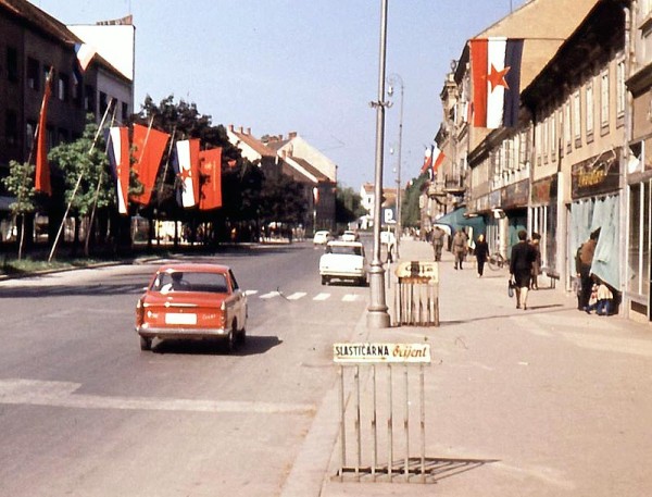Desno je kino. Tamo ravno su partizani. Mislim, onaj spomenik, to su partizani. Tamo gdje je hrpa klinaca, pomalo pijanih.