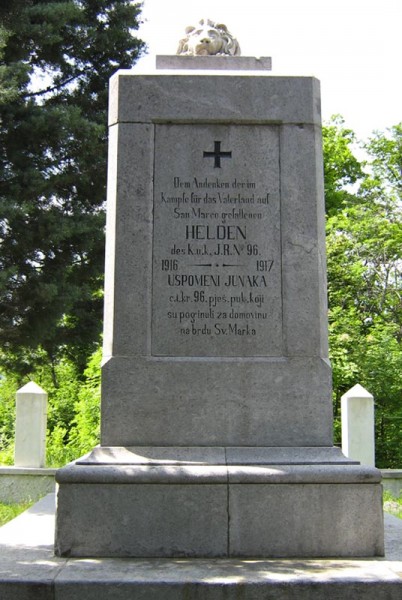 6. Sočansku bitku su Karlovčani iz 96. pješačkog puka dočekali razmješteni na vrhu brda Sv. Marko iznad Šempetra kod Gorice u Vipavskoj dolini i branili ga od osvajanja talijanskih ratnika. U toj bitci je poginulo mnogo Karlovčana, koji su pokopani po Vipavskoj dolini, a najviše na groblju u selu Črniče. Na centralnom spomeniku je napis: