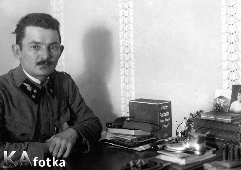 Desno od Alfonsusa Šibenika, na stolu, fotoaparat GOERZ ANGO ANSCHUTZ (klapp kamera) , pištolj hahn steyr cal 9x24 steyr, i krajnje desno fotografije obitelji