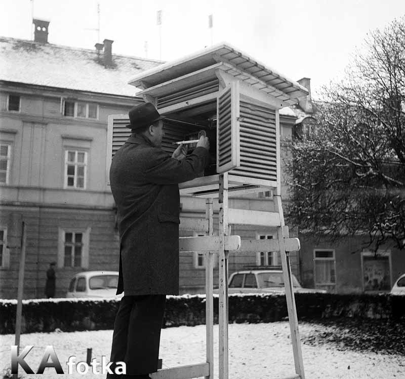 Meteorološka postaja najprije se nalazila pred Gimnazijom na Rakovcu (1863.-1945.), zatim u „Šancu“ (1945.-1955.), pa ispred Komercijalne banke (1955.-1992., na slici, danas Karlovačke banke), potom u blizini zgrade Hrvatskih šuma (1992.-2001.) i posljednje u novoizgrađenom objektu Glavne meteorološke postaje Karlovac kod Šumarske škole. Postaja obavlja opažanja i mjerenja temperature zraka, tla i vode, iznos i promjenu tlaka zraka, vlažnost zraka, brzinu i smjer vjetra, vrstu i visinu naoblake, jakost sunčevog zračenja, vodostaj i protok na rijekama …… Motrenje u organiziranoj mreži meteoroloških postaja počinje u Karlovcu 1863.g. Prvi motritelj bio je profesor A. Lorenz, zatim A. Gavazzi, a onda i učenici Realne kr. Gimnazije. Najpoznatiji motritelji bili su gimnazijski profesori Zvonimir Celinščak (1915.-1930.) i Andrej Čepelj (1937.-1946.), potom profesionalni meteorološki motritelj Karlo Malpera - na slici (1946.-1992.). Nakon 1992. g. voditelji Postaje bili su Dubravko Došen, Jurica Mihovilović i Zoran Lasić. (Biserka Fabac)