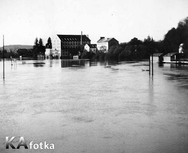 Fotografija poplave 1939. godine - motiv sa Korane, desno se vidi kupalište koje pliva na splavu, rijetka fotografija jer su večinom snimani motivi sa Kupe