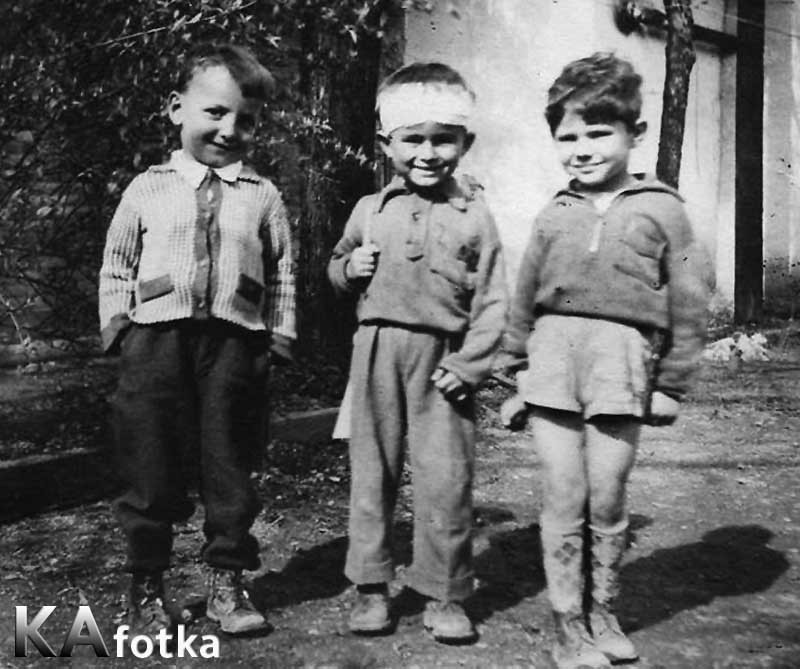 Ivica Galetić, Vladimir Petrović (sa razbijenom glavom) i Željko Mesar (desno) u igri 1957.