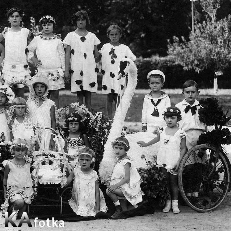 Cvjetni korzo 1930. - detalj: Na desnoj strani vidi se umjetnina gradskog vrtlara Kopřive: bijeli labud montiran na dječji autić. Labudovo perje – rezanci papira. (Dečko iza labuda, s bijelom kapom – Dubravko Šiftar)