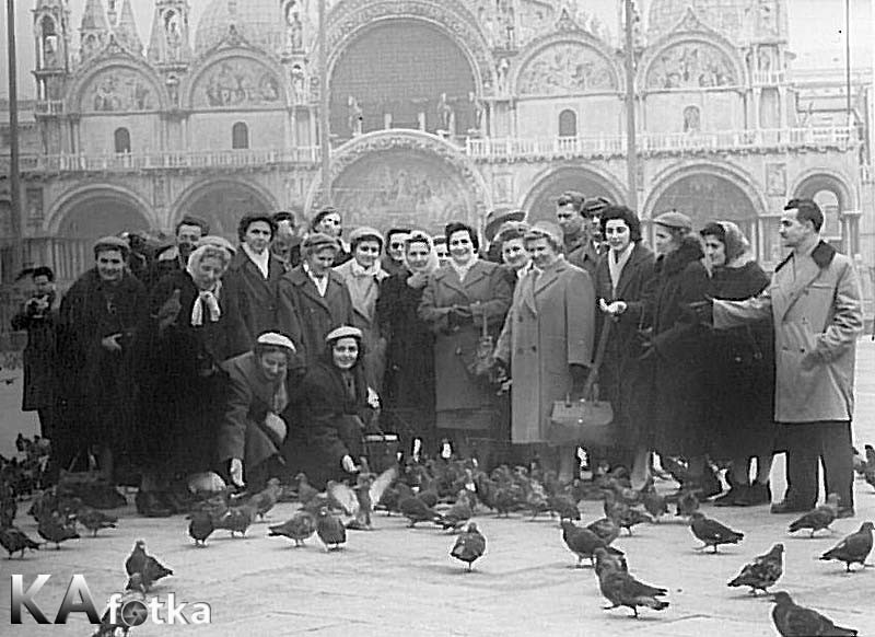 Učiteljska škola na izletu u Veneciji. Prof. Alfred Krupa sa razredom ispred crkve Sv. Marka. Rane 1950-te.