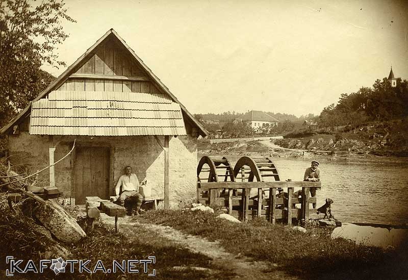Mlin u Protulipi uz rijeku Dobru, tzv.Vulakovićev mlin, u pozadini lipski Dvor i toranj Crkve Sv. Nikole biskupa, oko 1910. godine