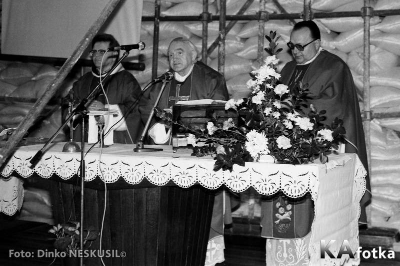 28. prosinca 1991. - Caritas i Karlovac posjetili su kardinal Fiorenco Angelini, izaslanik Svetog Oca Ivana Pavla II. u pratnji njegove uzoritosti zagrebačkog nadbiskupa Franje Kuharića. Na slici: fra Vlado Mustač, gvardijan franjevačkog samostana, nadbiskup Franjo Kuharić i dekan karlovačkog dekanata Viktor Štimac služe misu u crkvi Presvetog Trojstva ispred glavnog oltara zaštićenog vrećama pijeska.