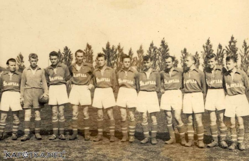 Nogometni klub Slavija 1950. godine: Pavlić, Hofer, ? , Antić, Cimeša, ? , Lang, Gorup, Pjer, ? , Biturajac