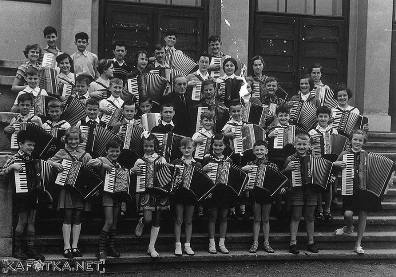 Prva grupa harmonikaša Triglava  na stepenicama Hrvatskog doma 1955. godine. Neposredno do doma uzduž ulice nalazila se prizemnica u kojoj su vježbali pod ravnanjem dirigenta Kubičeka (na slici, u sredini). Poslije su dirigenti bili Božo Tuhtan i Stanko Poljančić.