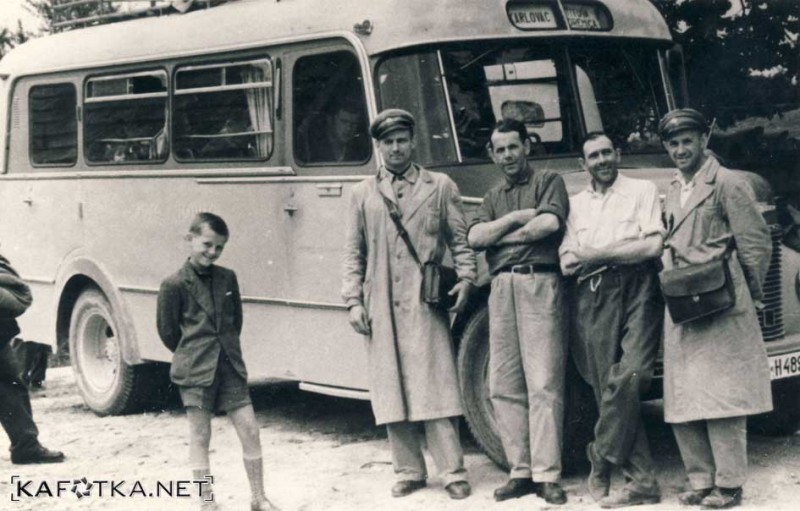 Pedesetih i šezdesetih godina prošlog stoljeća karlovačka pošta obavljala je javni prijevoz svojih pošiljaka i putnika u Pokuplju, Žumberku, Kordunu i Lici sve do Korenice. Na fotografiji su vozači i kondukteri (u kutama) ispred autobusa marke Bedford (sličan onom iz kultnog jugoslavneskog filma Ko to tamo peva). Sasvim desno Dragutin Močvan, poznati gradski pismonoša, poštar i nogometni sudac. Za Kafotku fotografiju ustupila kćerka Višnja.